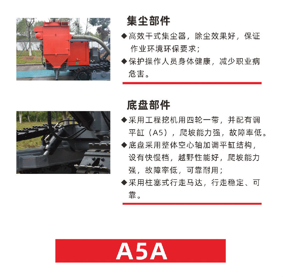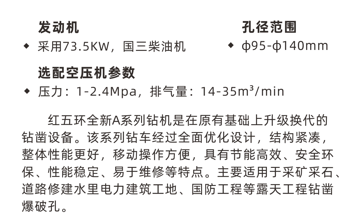 紅五環(huán)全新A系列鉆機(jī)是在原有基礎(chǔ)上升級(jí)換代的鉆鑿設(shè)備。該系列鉆車(chē)經(jīng)過(guò)全面優(yōu)化設(shè)計(jì),結(jié)構(gòu)緊湊,整體性能更好,移動(dòng)操作方便,具有節(jié)能高效、安全環(huán)保、性能穩(wěn)定、易于維修等特點(diǎn)。主要適用于采礦采石、道路修建水里電力建筑工地、國(guó)防工程等露天工程鉆鑿爆破孔。